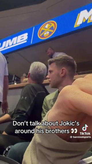 掘金主场打国王,场边镜头扫到约基奇的大哥Strahinja对着观众席咆哮。有球迷拍到他在包厢里指着下方骂骂咧咧,疑似回应有人对弟弟垃圾话。这画面在Reddit上疯传,评论区第一条高赞是:"这人每次出现都更红更壮,50岁前怕是要炸。"